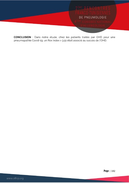 CONCLUSION : Dans notre étude, chez les patients traités par OHD pour une pneumopathie Covid-19, un Rox index > 3,51 était associé au succès de l’OHD. Page | 182